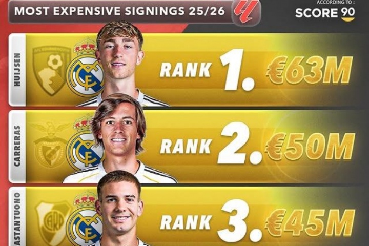 1、赫伊森,伯恩茅斯→皇马,6300万欧