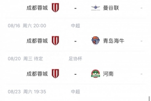 根据赛程,蓉城8月还有6场比赛,分别是8月8日联赛客战大连英博、8月12日亚冠精英联赛附加赛主场对阵曼谷联、8月16日联赛主场对阵青岛海牛、足协杯主场对阵河南队(时间待定)、8月23日联赛客场对阵云南玉昆以及8月30日联赛主场对阵海港。