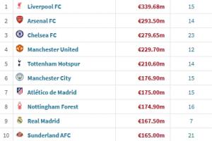 1.利物浦:3.40亿欧