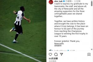 伊萨克写道:“我要向我的队友们、工作人员们,向大家,尤其是纽卡斯尔这座城市以及所有出色的球迷们,表达我的感激之情,感谢我们一起度过的这难以忘怀的三年。