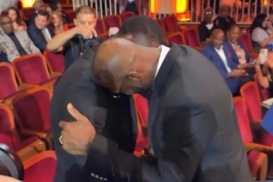 詹姆斯更新Instagram Story动态,转发他在名人堂现场拥抱韦德的片段,并评论道:“很高兴见到我的兄弟!⚡×👑”