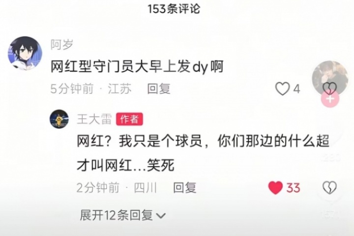 该网友评论:“守门员大早上发dy啊”。王大雷随后回复:“网红?我只是个球员,你们那边的什么超才叫网红...笑死”。