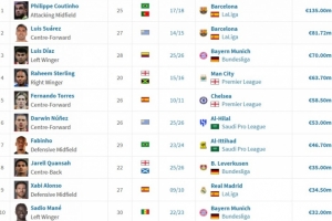1.库蒂尼奥 25岁 17/18赛季 卖给巴萨 1.35亿欧