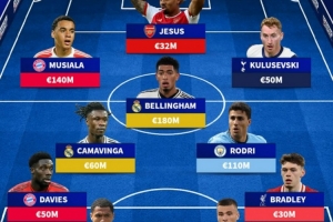 前锋:穆西亚拉(拜仁)、热苏斯(阿森纳)、库卢塞夫斯基(热刺)